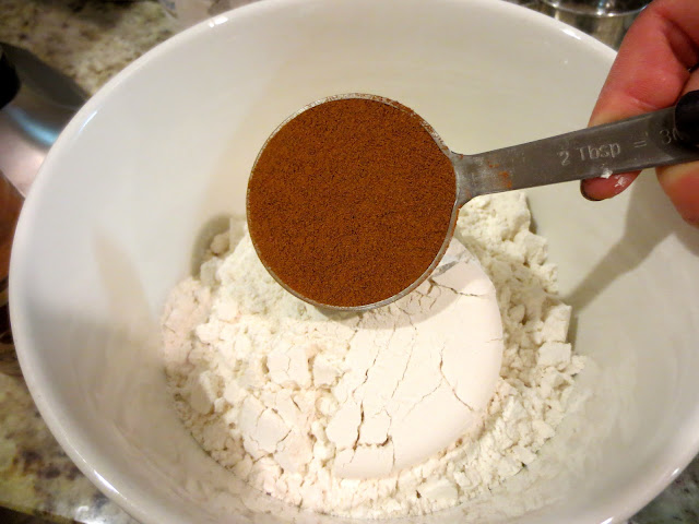 2. In a large bowl, whisk together the flour, cinnamon, baking powder, baking soda, salt, ginger and nutmeg. Set aside.